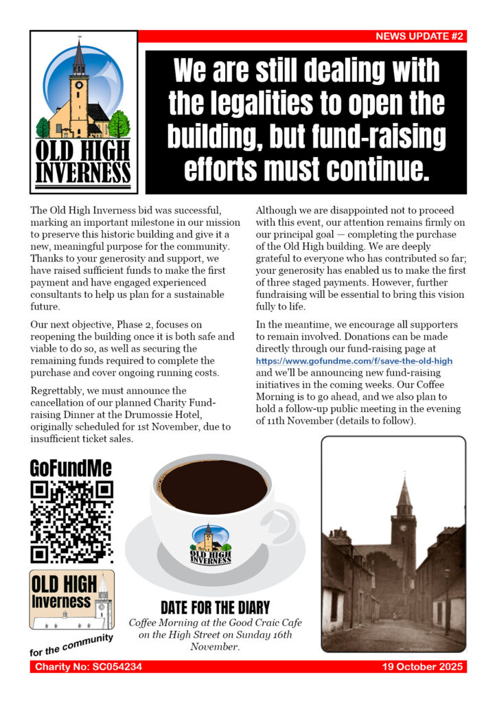 The Old High Inverness board made an offer to buy the building from the Church of Scotland and our ‘Heads of Terms’ were accepted. So thanks to everyone involved, we have made a big step forward.